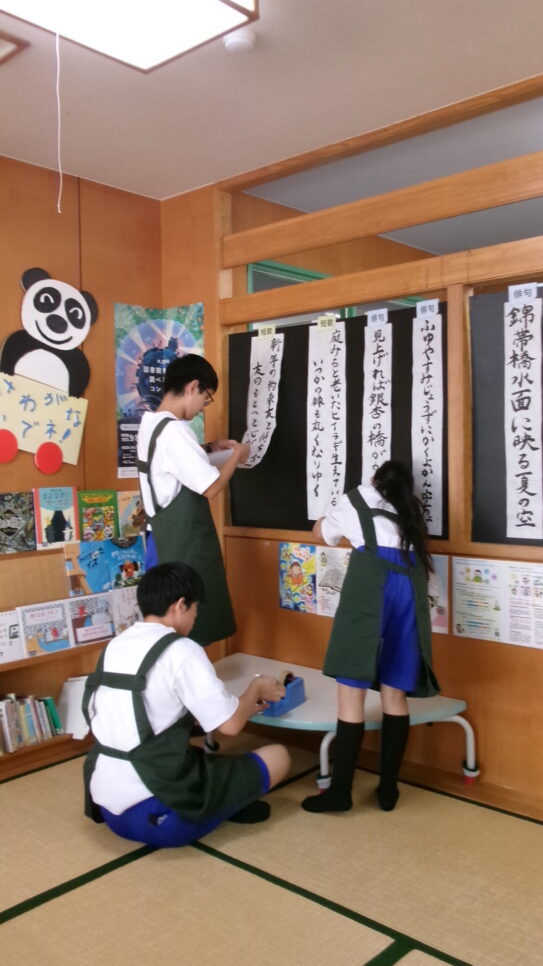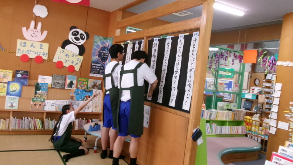 3人で役割分担をして展示物の飾り付けや、団体貸出本の選書など、