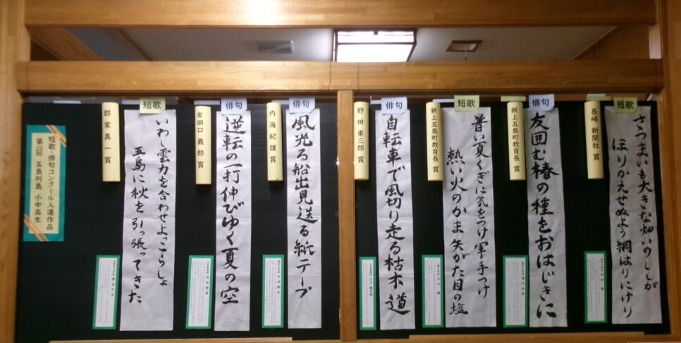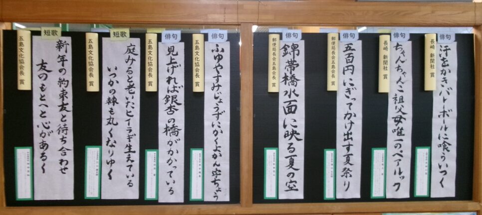 児童書側に「第29回 五島列島 小中高生 短歌・俳句コンクール」の入賞作品を展示しています。